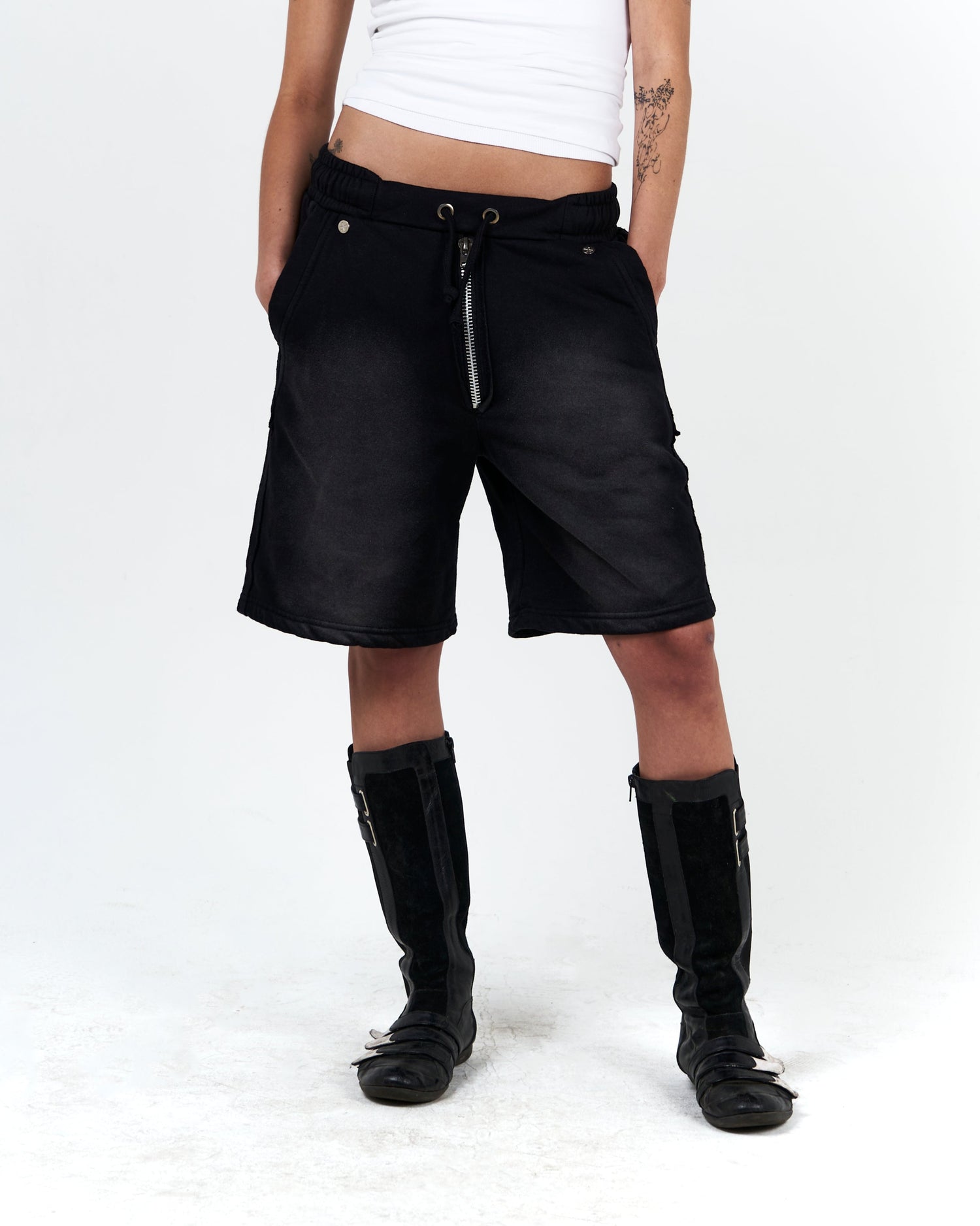 Long short de fit oversize que posee cordón ajustable y cierre al centro decorativo. Este diseño posee desgaste focalizado similar al HOODIE_BLOCK con el propósito de usarse como conjunto o por separado.